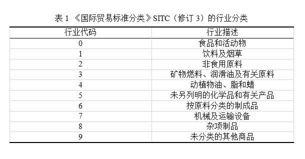 “国际贸易标准分类”(SITC) 将商品分为0-9类共10大类别部门,其中SITC0 部门商品为食品和活动物,SITC1 部门商品为饮料及烟草,SITC2部门商品为非食用原料(不包括燃料),SITC3部门商品为矿物燃料、润滑油及有关原料,SITC4部门商品为动植物油、脂和蜡,SITC5部门商品为未列明的化学品和有关产品,SITC6部门商品为主要按原料分类的制成品,SITC7部门商品为机械及运输设备,SITC8 部门商品为杂项商品,SITC9 部门商品为未分类商品。以上其中0-4 类可归为初级产品,5-9 类为工业制成品。